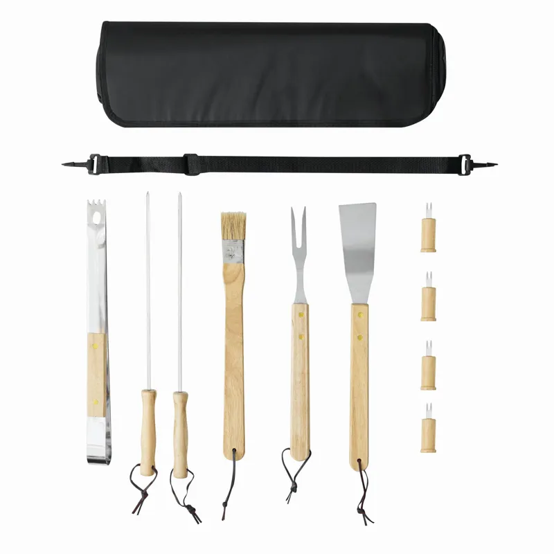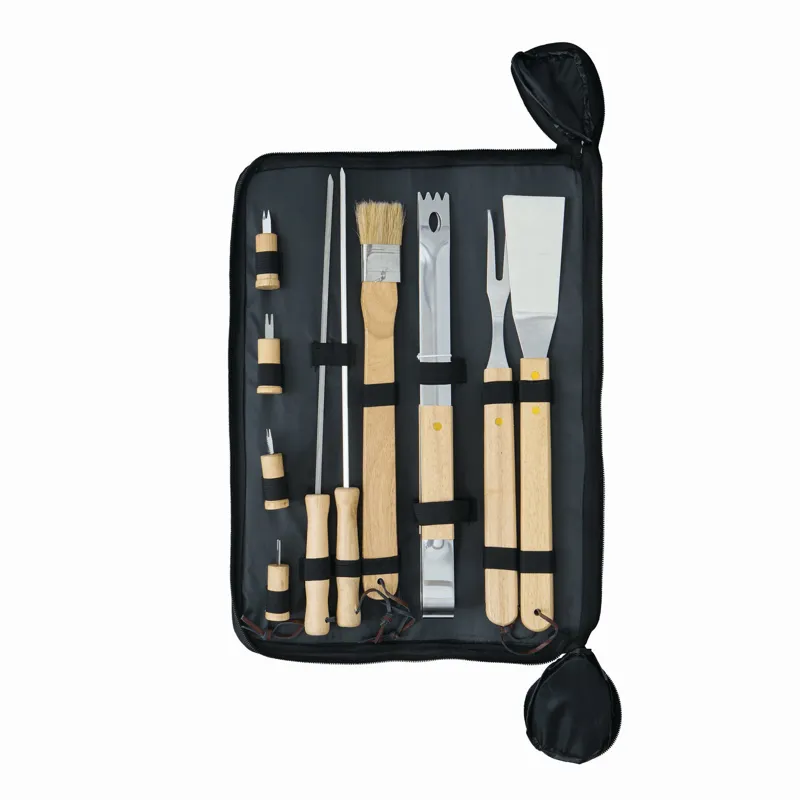 FRIED grill készlet, minőségi rozsdamentes acélból, fa nyéllel, cipzáras táskába csomagolva