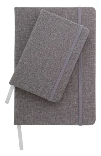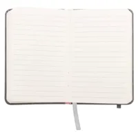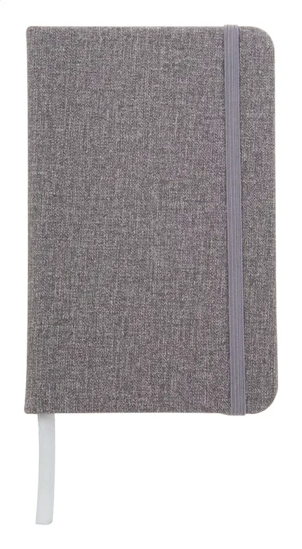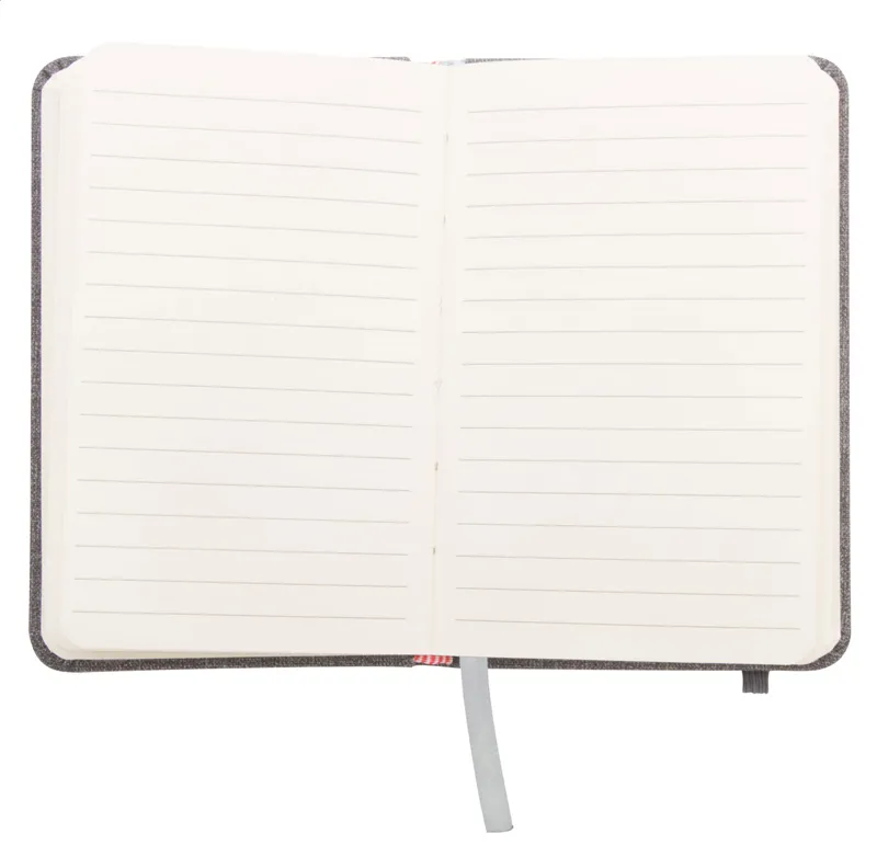 PU bőr borítású textil hatású jegyzetfüzet 80 vonalas lappal, gumipánttal zárható. A6 méretű.