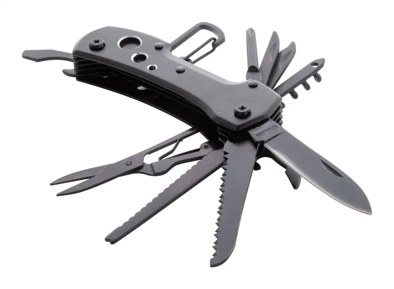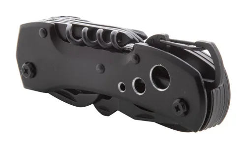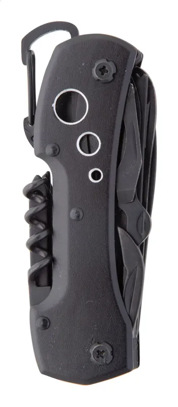 Fekete, rozsdamentes acél zsebkés alumínium nyéllel, karabinerrel és 13 funkcióval.
