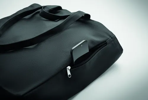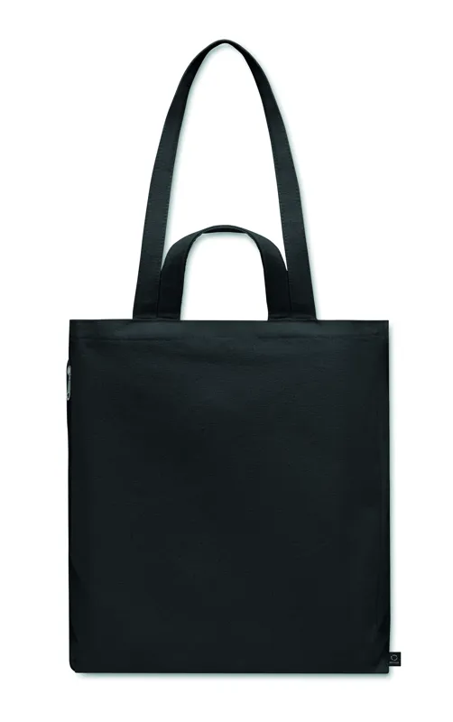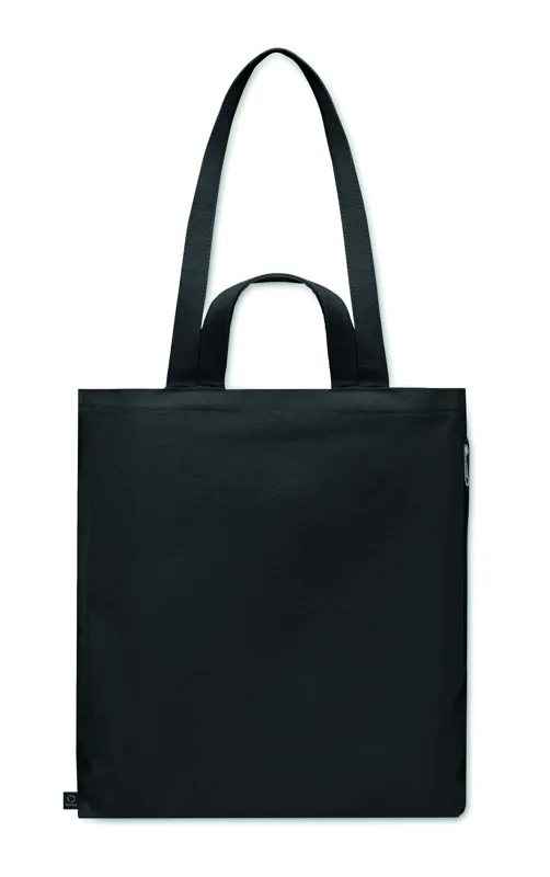 Újrahasznosított kevertszálas bevásárló- vagy strandtáska (70% újrahasznosított pamut, 30% újrahasznosított poliészter) rövid fülekkel, oldalsó cipzáras zsebbel. 380 g vastag anyag.