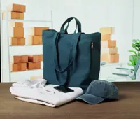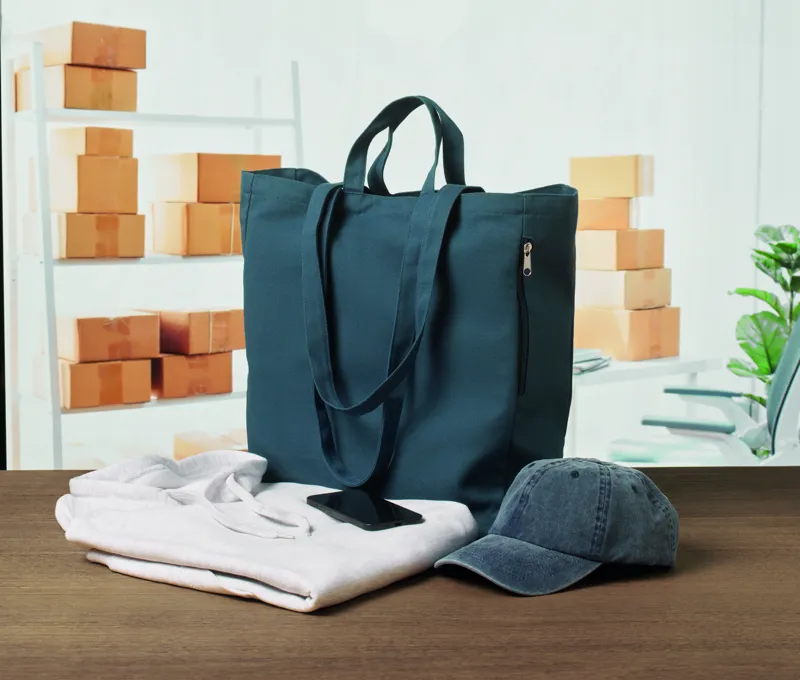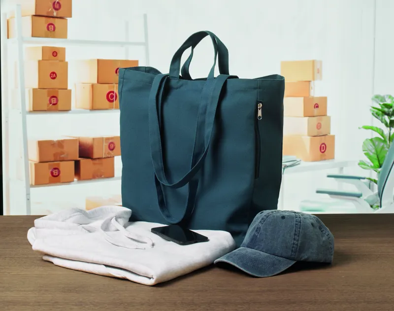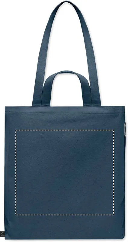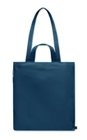 Újrahasznosított kevertszálas bevásárló- vagy strandtáska (70% újrahasznosított pamut, 30% újrahasznosított poliészter) rövid fülekkel, oldalsó cipzáras zsebbel. 380 g vastag anyag.