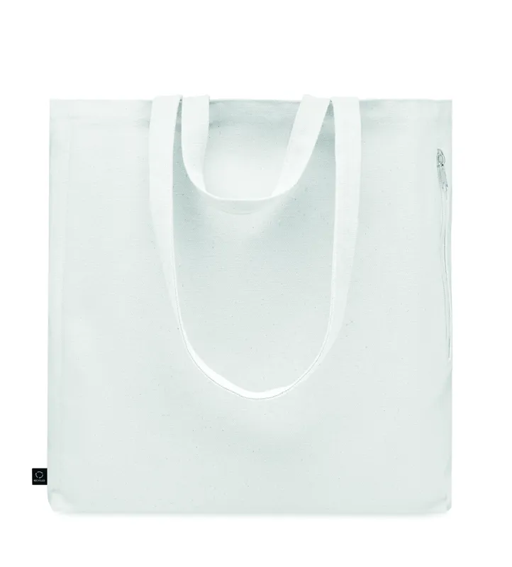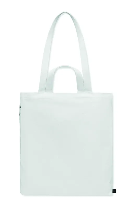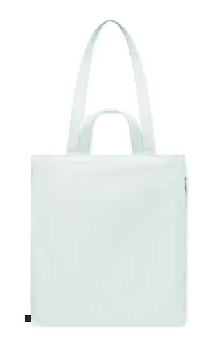Újrahasznosított kevertszálas bevásárló- vagy strandtáska (70% újrahasznosított pamut, 30% újrahasznosított poliészter) rövid fülekkel, oldalsó cipzáras zsebbel. 380 g vastag anyag.
