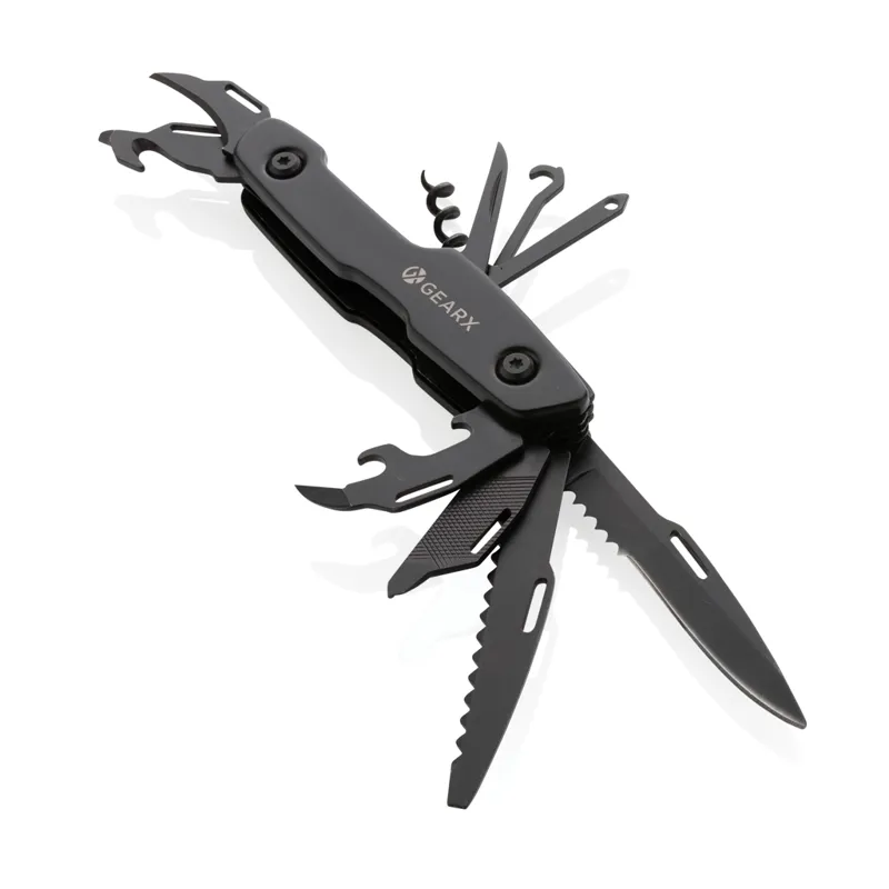 Egyenes, tiszta vonalak nagyszerű funkcionalitással kombinálva, zsebméretben. Az elegáns alumínium testhez prémium minőségű 420 rozsdamentes acél szerszámok tartoznak, fekete színben. A 13 funkció a következőket tartalmazza: kés, fűrész, hornyos csavarhúzó, konzervnyitó, reszelő, kicsi Philips csavarhúzó, dugóhúzó, szálvezető, bőrlyukasztó, dobozvágó, palacknyitó és kis penge. A multifunkciós kés szükség esetén mindig használatra kész. Elegáns ajándékdobozban.