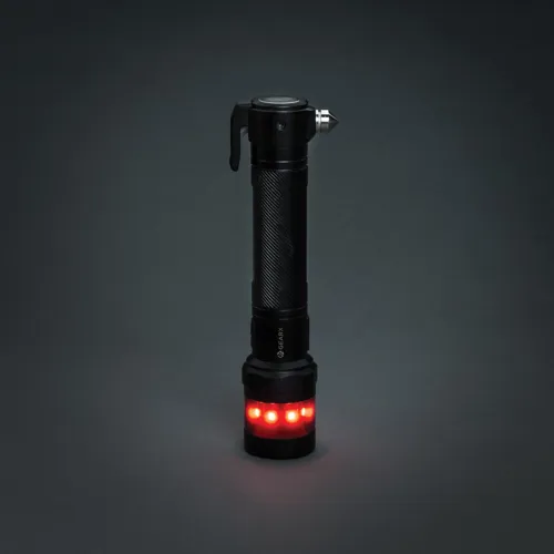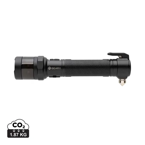 Nagy teherbírású autóbiztonsági eszköz RCS újrahasznosított alumíniumból és ABS-ből. Teljes újrahasznosított anyagtartalom: 59% a termék összsúlya alapján. Az RCS-tanúsítvány biztosítja az újrahasznosított anyagok ellátási láncát. A zseblámpa újratölthető, A-fokozatú, 2000 mAh-s lítium akkumulátorral működik, így nem kell cserélni az elemeket. Egyszerű újratöltés az USB-aljzaton keresztül. Erőteljes, 500 lumen fénnyel, akár 100 méteres fénysugárral. A LED lámpának 4 üzemmódja van (100%, 50%, 30% és villogó) Piros vészjelző LED-del, amely 3 üzemmódban működik (gyors villanás, lassú villanás és SOS). Integrált biztonsági öv vágóval és ablaktörő kalapáccsal. Mágneses felületre rögzíthető mágnessel. Üzemidő egy töltéssel: 2 óra. IPX4 vízálló.
