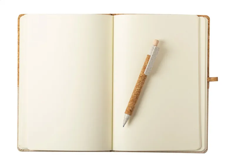 Természetes parafa és pamut bevonatú jegyzetfüzet 80 sima A5 méretű lappal. Tartalmaz egy parafával borított búzaszalma műanyag golyóstollat, fekete tollbetéttel.