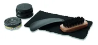 5 részes luxus cipőtisztító készlet műbőr tokban. A készlet tartalmaz egy fekete cipőtisztító kendőt, egy fekete cipőkanalat, egy fa cipőkefét, egy cipőfényező szivacsot és egy semleges színű cipőfényező pasztát.