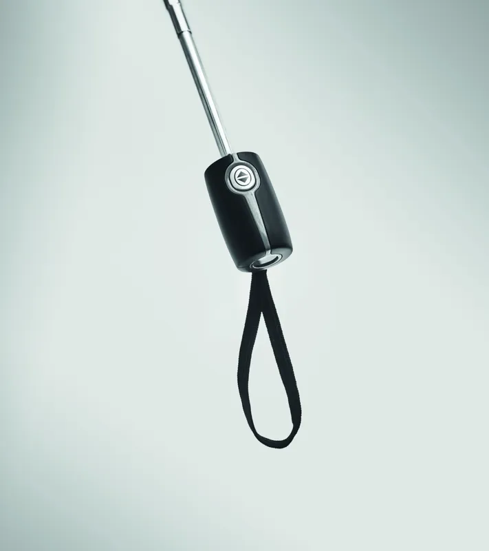 21 colos, luxus, automata, 3 szakaszos összecsukható viharesernyő 190T nyersselyemből. Acél nyél, fekete üvegszálas váz és fém csúcsok. Fekete gumírozott markolat műgyanta matricával. Hozzáillő tokban. Automata záródás.