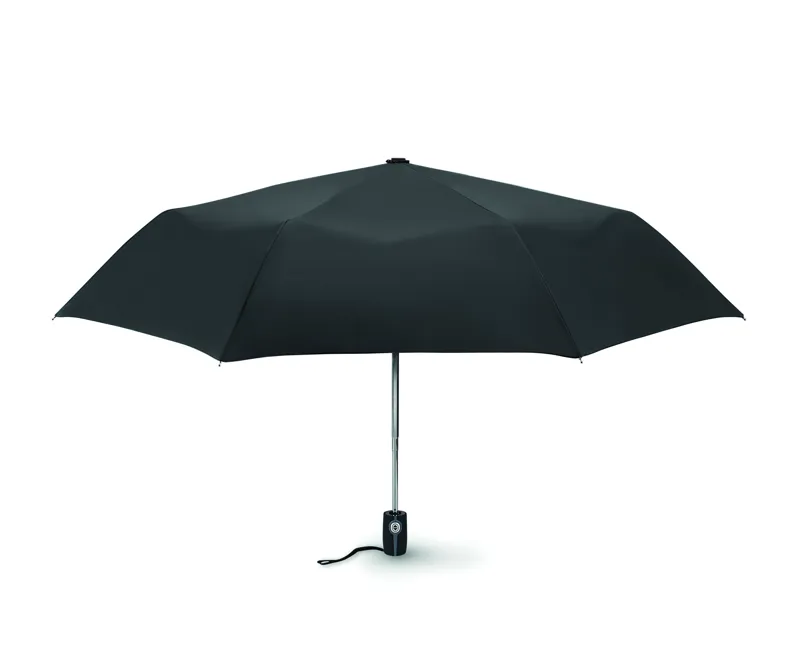 21 colos, luxus, automata, 3 szakaszos összecsukható viharesernyő 190T nyersselyemből. Acél nyél, fekete üvegszálas váz és fém csúcsok. Fekete gumírozott markolat műgyanta matricával. Hozzáillő tokban. Automata záródás.