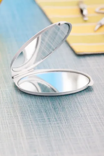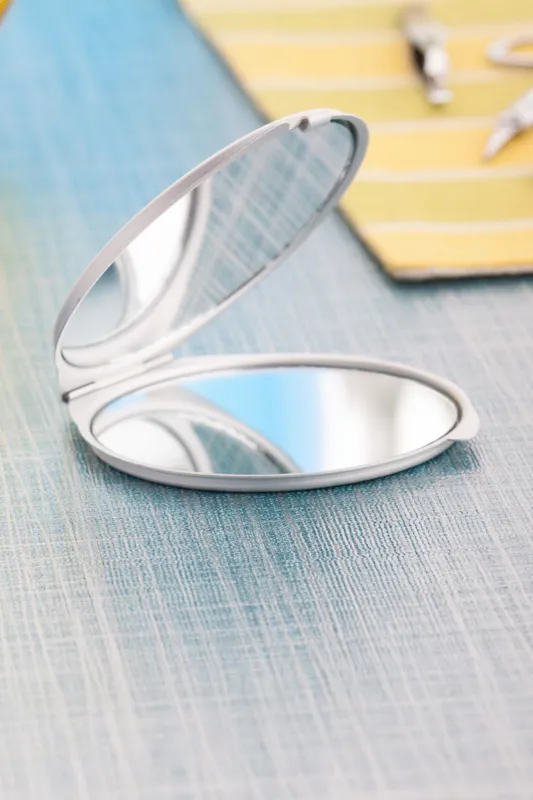 Alumínium zsebtükör: egy normál és egy nagyítós tükörrel.