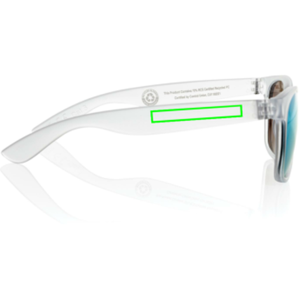 RCS újrahasznosított, átlátszó PC kerettel rendelkező napszemüveg színes tükörlencsékkel. Teljes újrahasznosított anyagtartalom: 72% a termék összsúlya alapján. Az RCS-tanúsítvány biztosítja az újrahasznosított anyagok ellátási láncát. A lencsék az EN ISO 12312-1, UV 400 és CAT 3 szabványoknak megfelelnek. FSC® kraftdobozban.