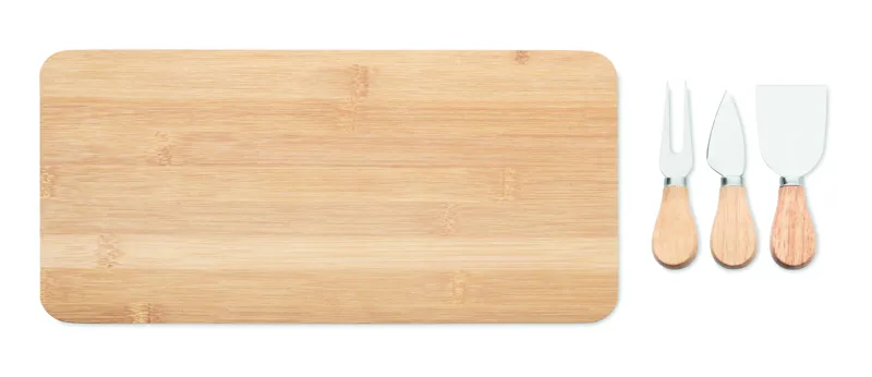Bambusz sajtkészlet egy tálalódeszkával, 2 sajtkéssel és egy villával. Szolgáljon fel egy sajttálat stílusosan ezen a természetes megjelenésű fa tálalódeszkán a hozzá illő evőeszközökkel. Más típusú ételek és rágcsálnivalók tálalásához is használható partikon vagy vacsorán. A bambusz természetes anyag, termékenként szín- és méretbeli eltérések jelentkezhetnek, ami befolyásolhatja a dekoráció végső eredményét. FSC®-certified | FSC 100%, N5.7, FSC-C213206