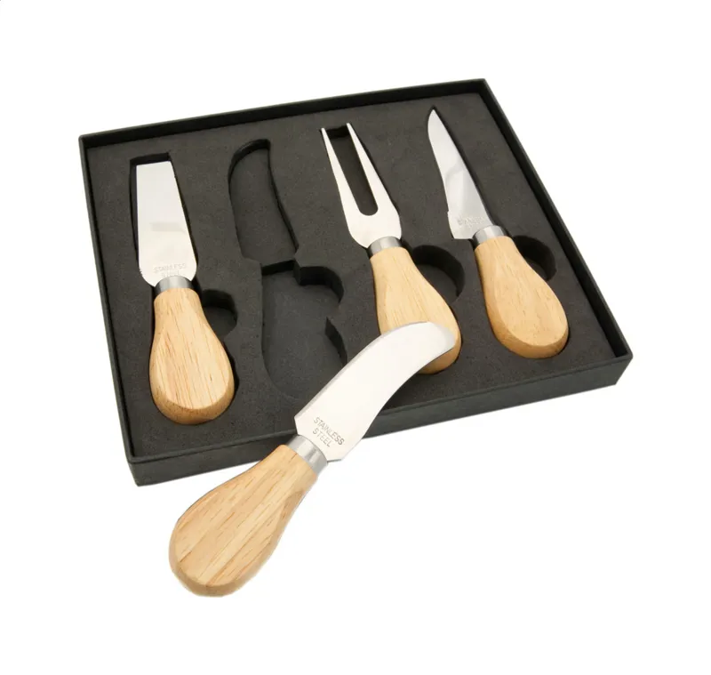 4 féle rozsdamentes acél sajtkés fa nyéllel, fekete díszdobozban szállítjuk.