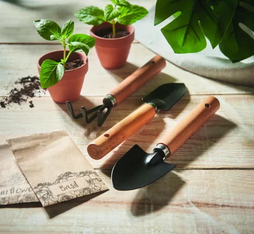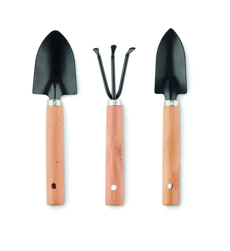 3 darabos kerti szerszámkészlet. Gereblye és 2 ásó. RPET filc tokban.