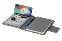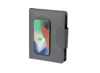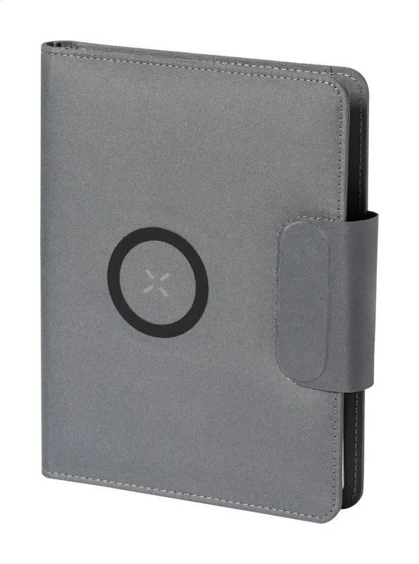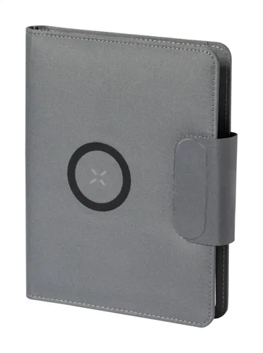 A5 méretű, 300D RPET poliészterből készült iratmappa. Beépített, mágneses vezeték nélküli töltővel (10W), 5000 mAh akkumulátorú power bank-kal és USB bemenettel ellátva. Egy összehajtható mobiltelefon-tartót és 65 vonalas lapot tartalmaz. Öntapadós fémgyűrűvel, ami minden vezeték nélküli töltővel ellátott eszközzel használható. USB töltőkábellel szállítjuk.