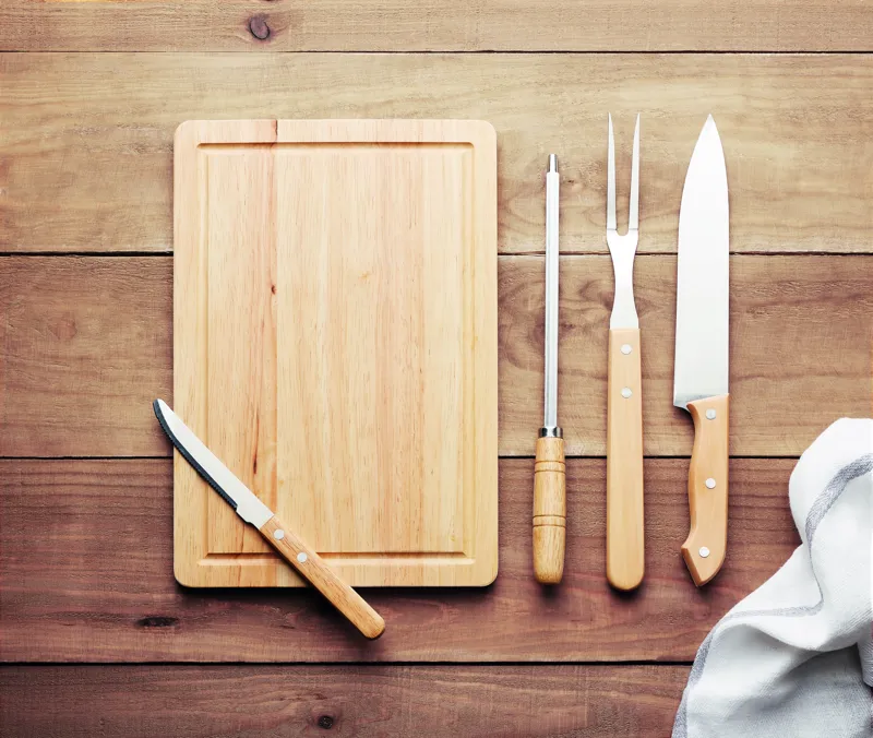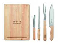 4 különböző, rozsdamentes acél grillező eszközből és fa vágódeszkából álló készlet, poliészter tartóban. A szett nagy húsvágó kést, egy kisebb kést, húsforgató villát és fenőacélt tartalmaz. A bambusz természetes anyag, színében, mintázatában és méretében esetenként eltérő lehet.