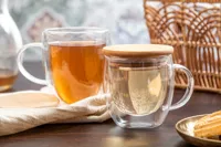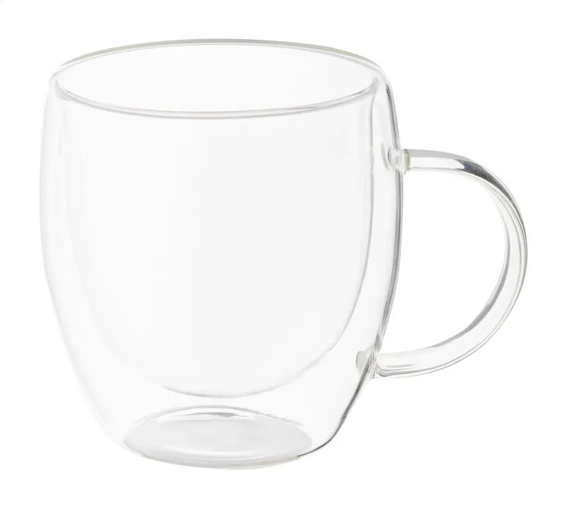 Duplafalú boroszilikát üveg termo bögre fogantyúval és bambusz tetővel, 250 ml. Kraft papír dobozban.