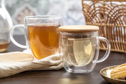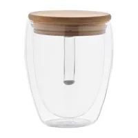 Duplafalú boroszilikát üveg thermo bögre, füllel és bambusz fedővel, 350 ml. Kraft papír dobozban szállítjuk.