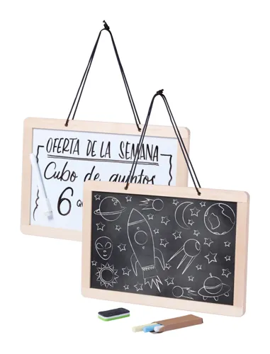 Kétoldalú üzenőtábla: fekete krétatábla és fehér szárazon törölhető tábla. 3 krétával, 1 filctollal és letörlővel együtt szállítjuk.
