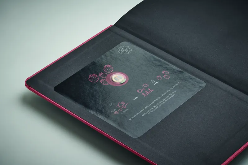 A5 jegyzetfüzet, fenntartható keménytáblás borítóval. Cérnafűzött. 184 vonalas oldal (92 lap) újrahasznosított papírból. Pamut könyvjelző szalag. Virág- vagy gyümölcsmagokat tartalmaz. EU-ban gyártva. Ez a fenntartható jegyzetfüzet alacsony környezeti hatással bír, és remek reklámajándék. Minden színű jegyzetfüzethez más-más típusú mag tartozik, amelyet elültethet a kertjében. A színkód jelzi a mag fajtáját: áfonya (04), eper (05), százszorszép (13), alma (48) és fenyőfa (60).
