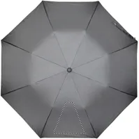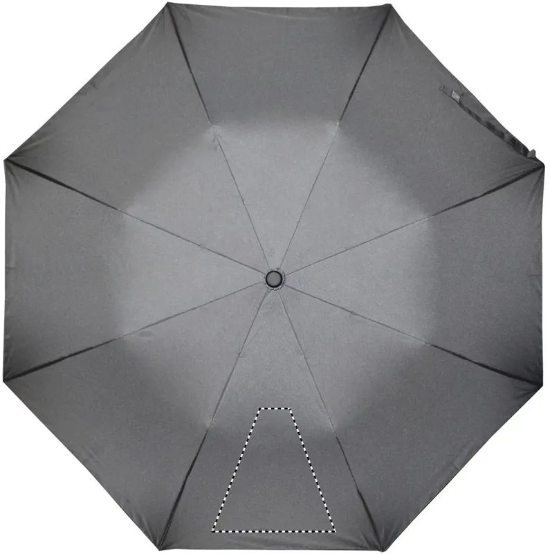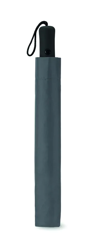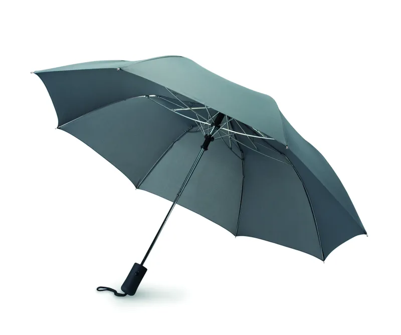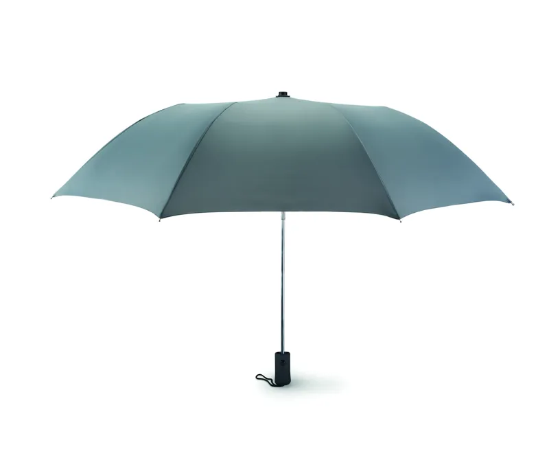 21 colos automata, 2 szakaszos összecsukható esernyő 190T nyersselyem anyagból. Galvanizált acél nyél, váz és csúcsok. Fekete gumírozott ABS markolat. Hozzáillő tokban. Manuális záródás.