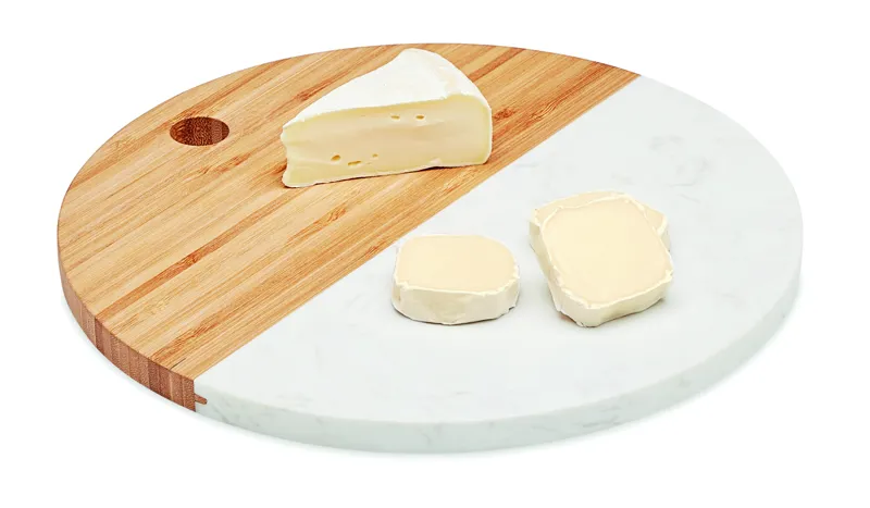 Tálalódeszka márványból és bambuszból. Kör alakú. A bambusz természetes anyag, színében, mintázatában és méretében esetenként eltérő lehet.