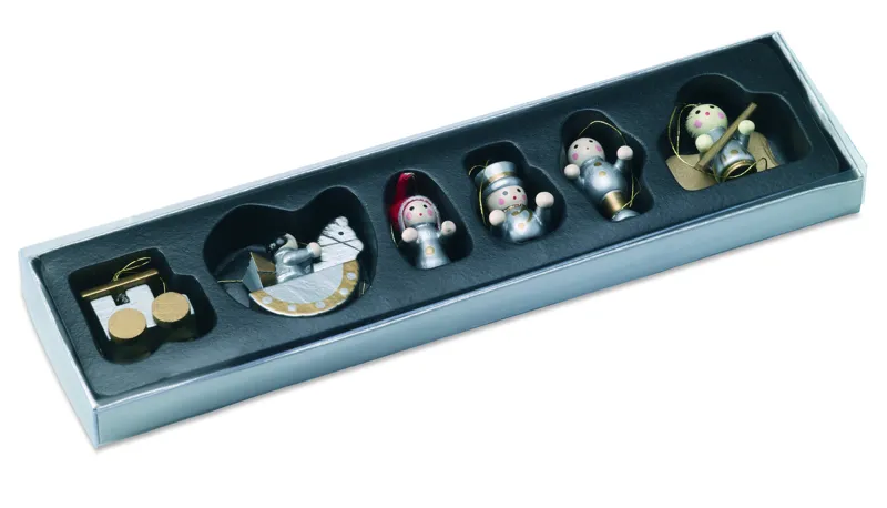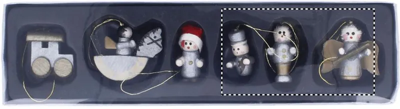 6 darabos fa karácsonyfadísz szett. Átlátszó fedelű kartondobozban.