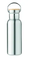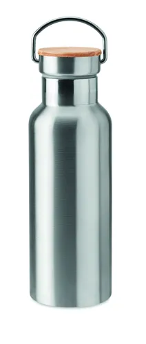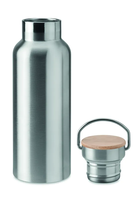 Duplafalú rozsdamentes acél termosz 500 ml űrtartalommal. Fém fogantyús bambusz kupakkal. A szublimációs nyomtatás csak a fehér színű terméken érhető el. Szivárgásmentes. A bambusz természetes anyag, színében, mintázatában és méretében esetenként eltérő lehet.