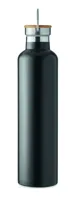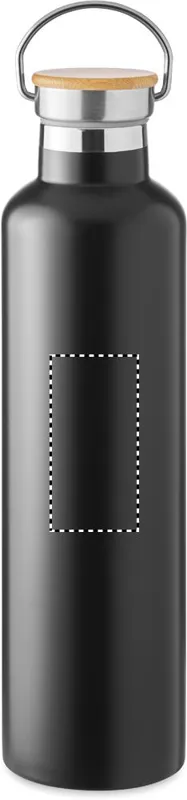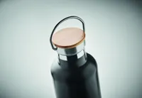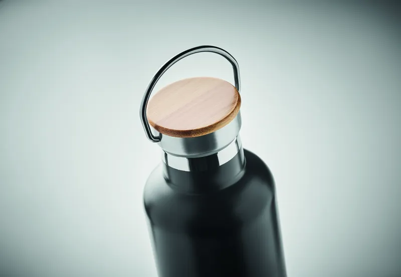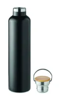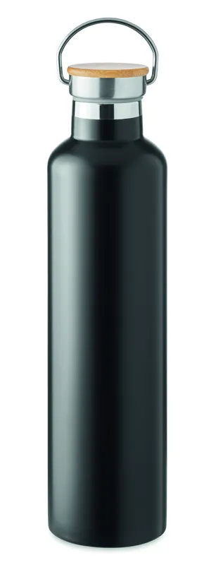 Duplafalú rozsdamentes acél termosz fém fogantyús bambusz kupakkal. Űrtartalom: 1 l. A bambusz természetes anyag, színében, mintázatában és méretében esetenként eltérő lehet.
