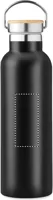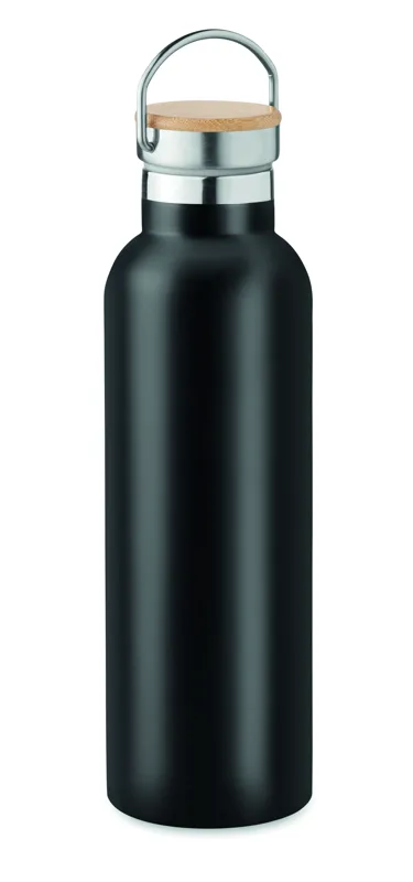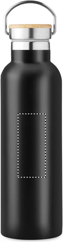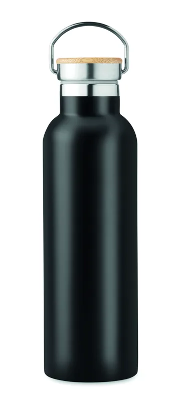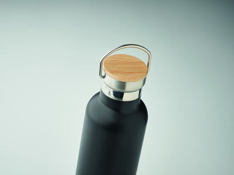 Duplafalú rozsdamentes acél termosz fém fogantyús bambusz kupakkal. Űrtartalom: 750 ml. Szivárgásmentes. A bambusz természetes anyag, színében, mintázatában és méretében esetenként eltérő lehet.