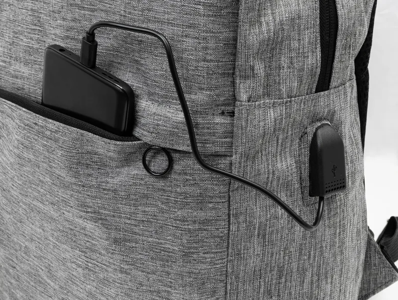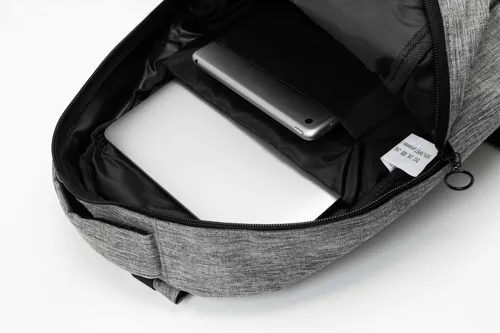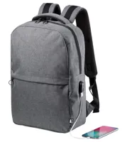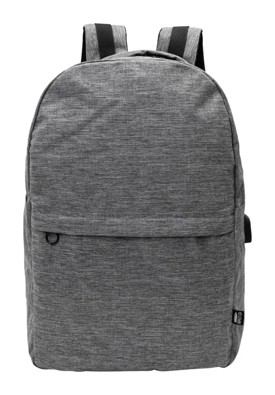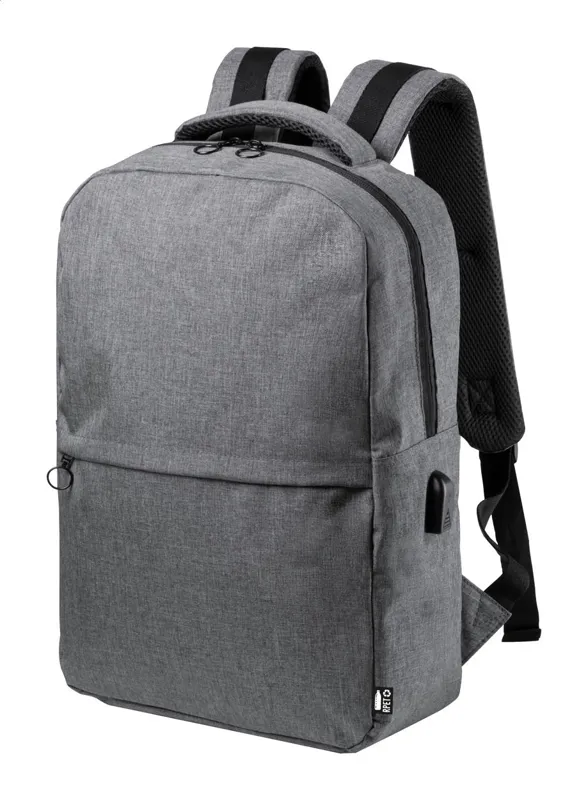 Hátitáska cipzáras rekeszekkel, párnázott laptop- (15") és tablettartó (10") rekesszel, párnázott hátrésszel és vállpántokkal. Megkülönböztető RPET címkével és beépített USB csatlakozóval power bankokhoz. 600D RPET poliészter.