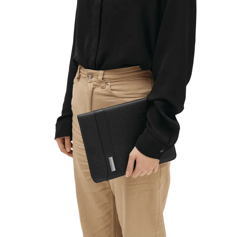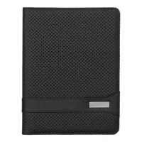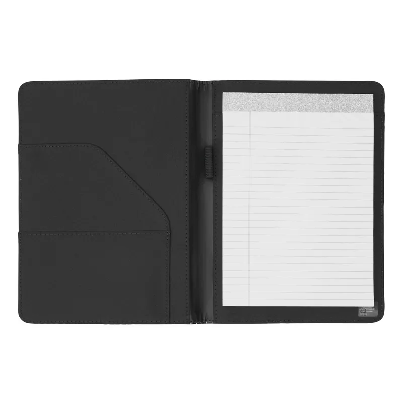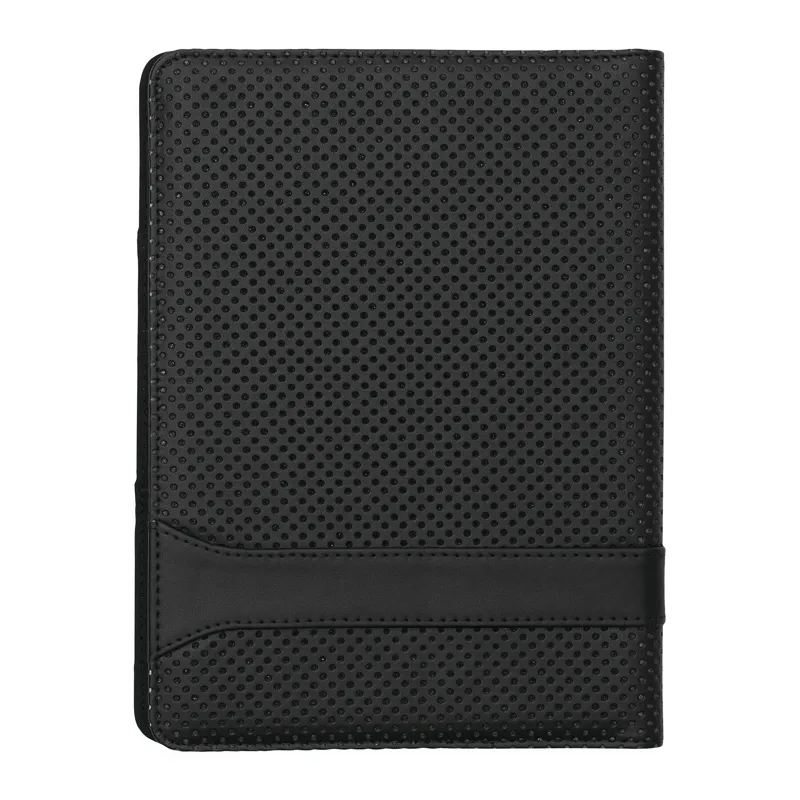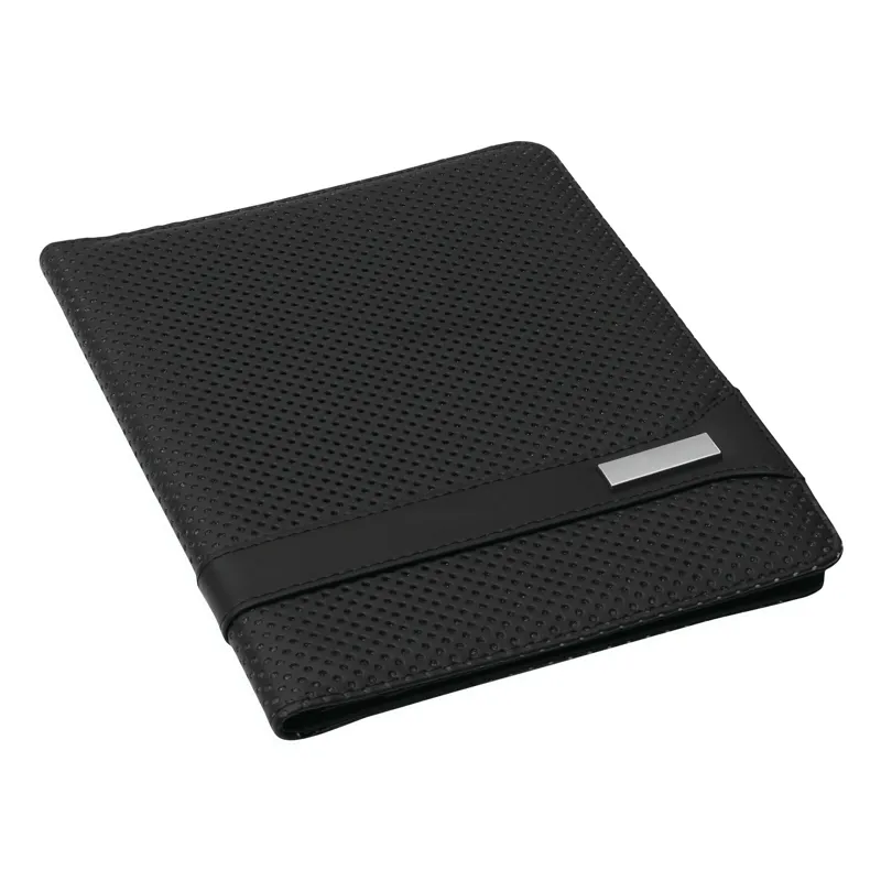 HILL DALE mappa, DIN A5 méret: különféle becsúsztatós zsebekkel, jegyzettömbbel, tolltartó pánttal – külsején nyomott lyukacsos dizájn, fém lappal az emblémája számára