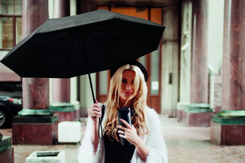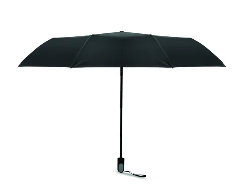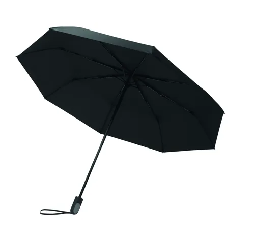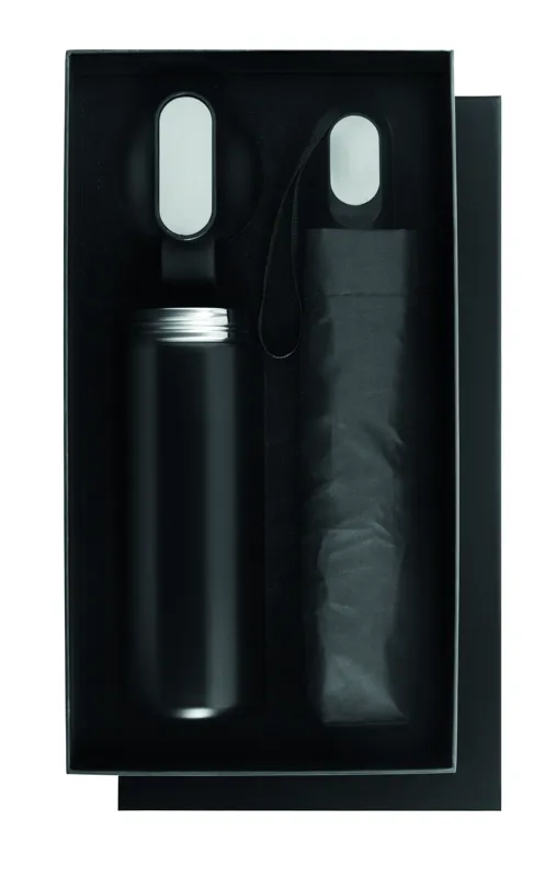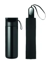 2 részes ajándékszett: 600 ml duplafalú, újrahasznosított rozsdamentes acél palack PP fedéllel, szilikon fogantyúval és 21 colos, összecsukható, szélálló pongee esernyő ABS markolattal, díszdobozban.