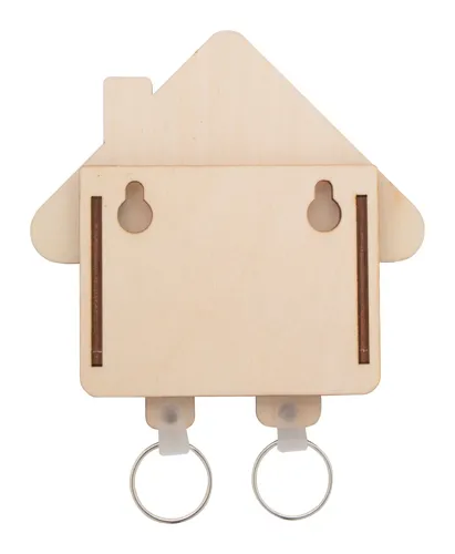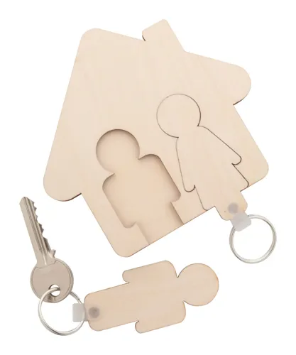Házalakú fali kulcstartó, melyből kiemelhető egy férfi és egy női alak. Rétegelt nyírfából készült.