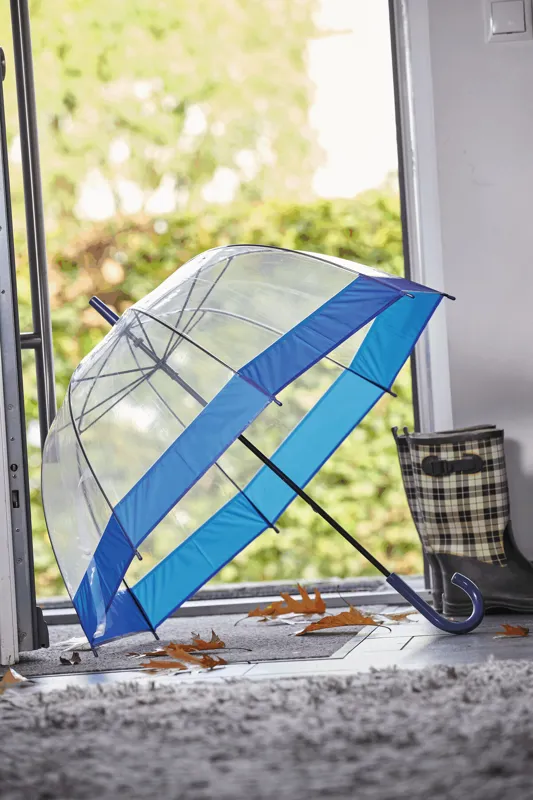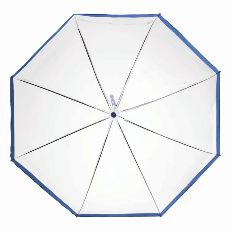 HONEYMOON kupola formájú esernyő: fém tengellyel és bordázattal, műanyag végekkel és csúccsal, műanyag hajlított véggel, átlátszó POE ernyő színes szegéllyel, nyomógombos összecsukás