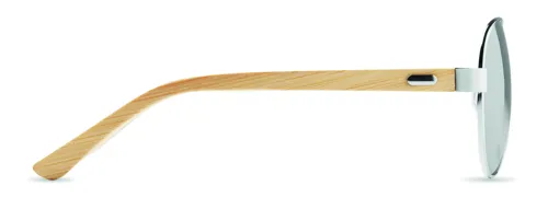 Napszemüveg bambusz szárral és színes tükörlencsével, mikroszálas tokban. UV400-as védelem. A bambusz természetes anyag, színében, mintázatában és méretében esetenként eltérő lehet.