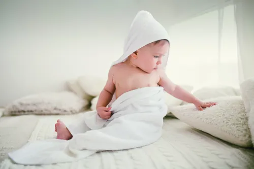 Pamutból készült kapucnis babatörölköző. 300 g/m² vastag anyag.