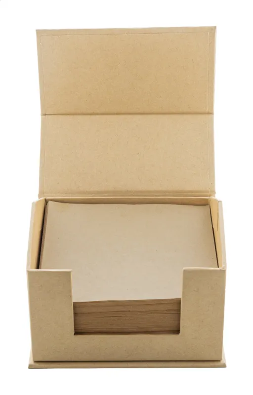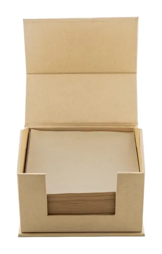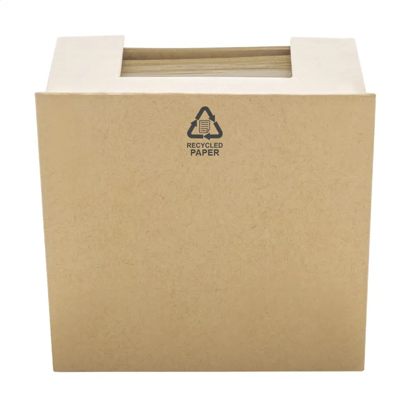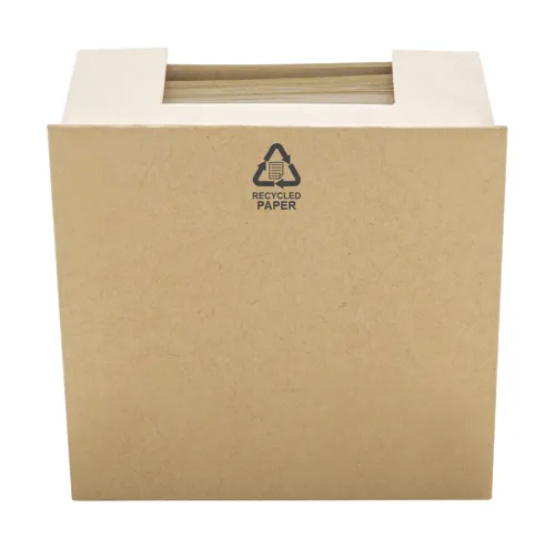 Ház alakú, újrahasznosított kartonból készült jegyzetadagoló 300 lapos újrahasznosított kraft papír jegyzetlappal. 25 sárga öntapadós jegyzetlapot és 100 oldaljelölőt (4 színben) tartalmaz a tetején.
