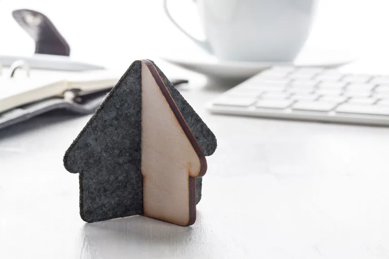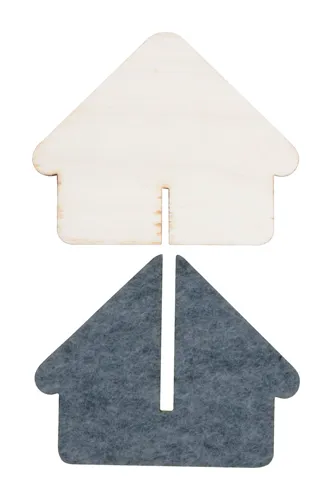 Mini ház alakú dekoráció fából és filc anyagból. Lapra szerelve szállítjuk.