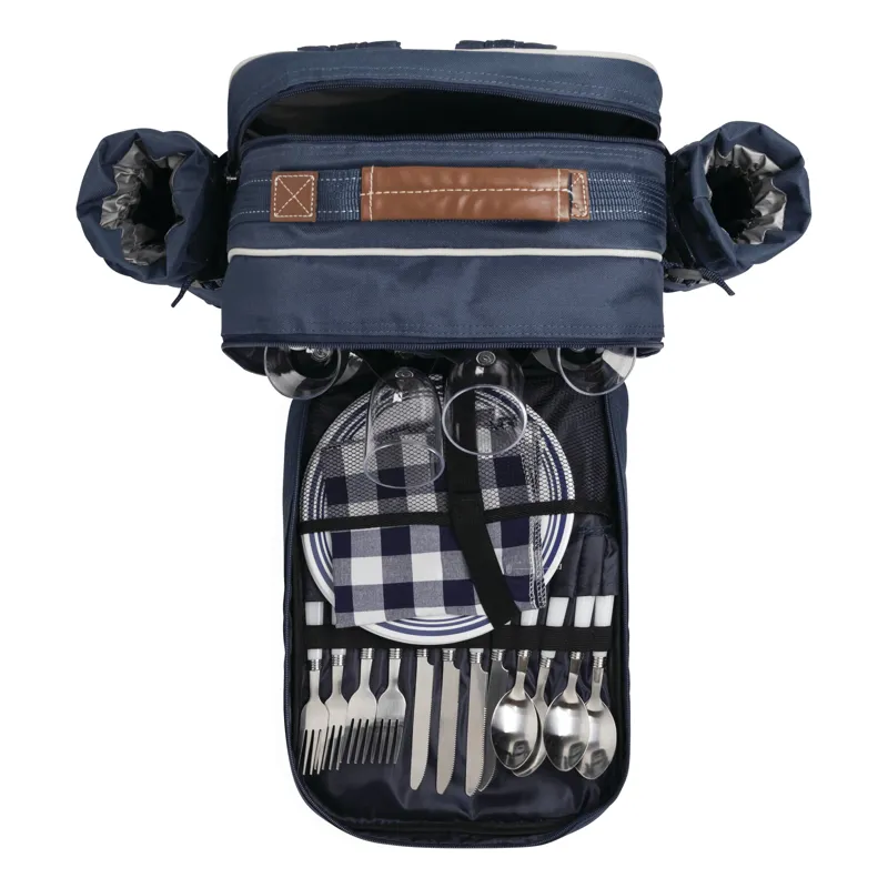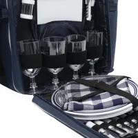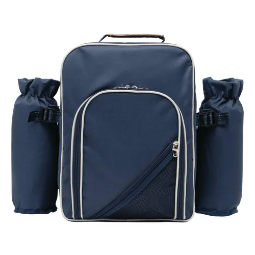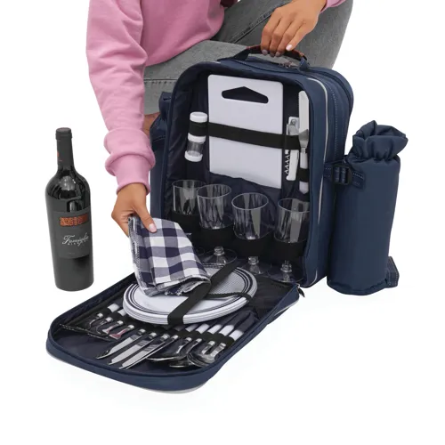 HYDE PARK piknik hátizsák, négyszemélyes, hűtő rekesszel, evőeszközökkel, műanyag edényekkel és borospoharakkal, sajtkéssel, üvegnyitóval, textil szalvétákkal, só- és borsszóróval és vágódeszkával