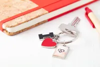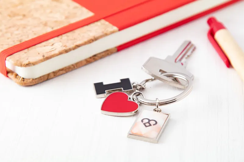 Fém kulcstartó 3 medállal: "I", szív és téglalap. Fekete díszdobozban szállítjuk.