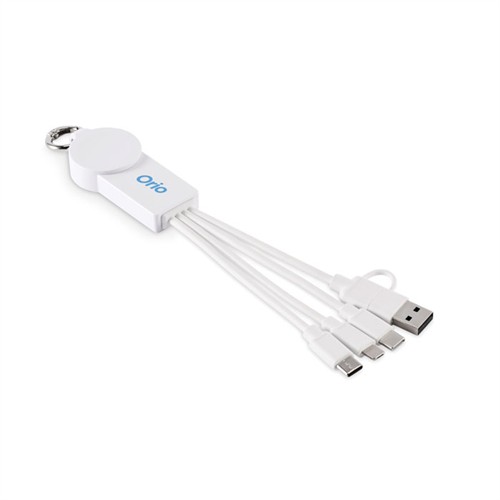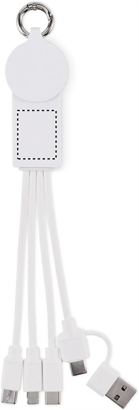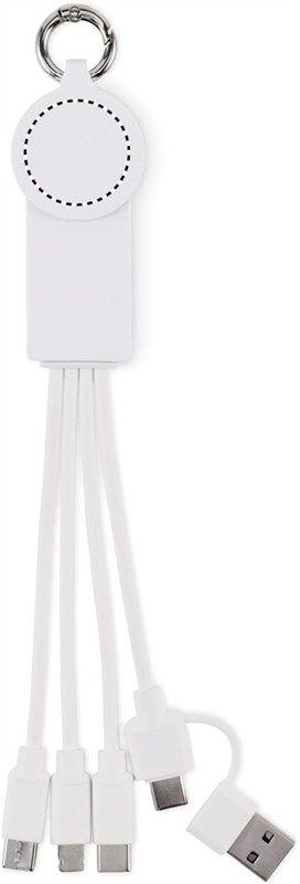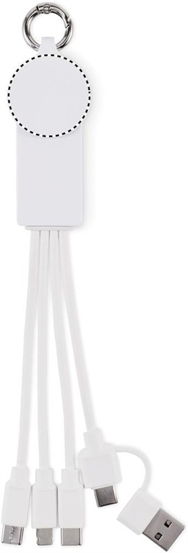 Kulcstartó töltőkábellel. Bemenet: 2 az 1-ben C-típusú és USB-A. Kimenet: okosóra töltő (Samsung® és Apple®), 2 x C-típusú és mikro-B (2 az 1-ben tűs). Újrahasznosított TPE kábel.