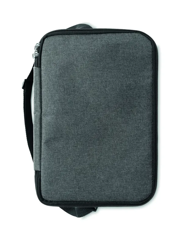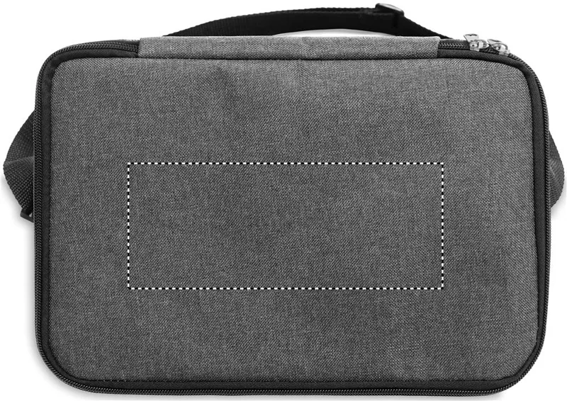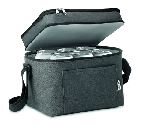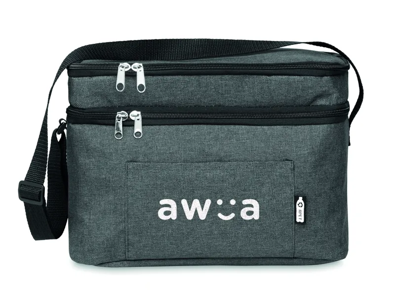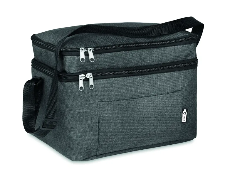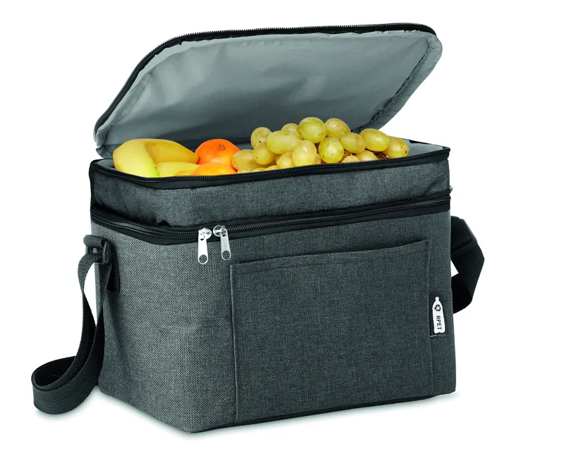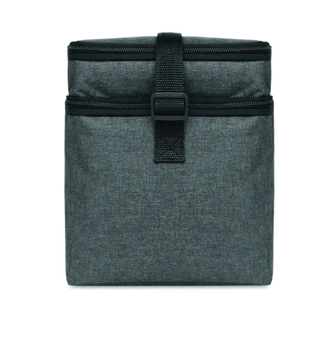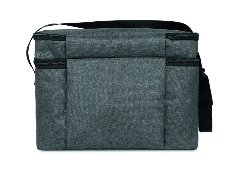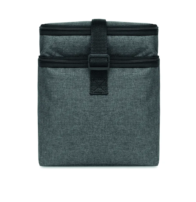 Melírozott színű, 600D RPET kétemeletes hűtőtáska, állítható vállpánttal, első zsebbel. Szigetelő anyag: 0.15mm PEVA + 3mm habszivacs.
