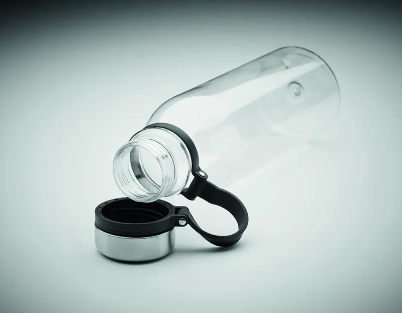 RPET kulacs rozsdamentes acél kupakkal, a könnyű szállítást biztosító TPR gumi pánttal. BPA mentes. Szivárgásmentes. Űrtartalom: 780 ml. Nem alkalmas szénsavas italokhoz.