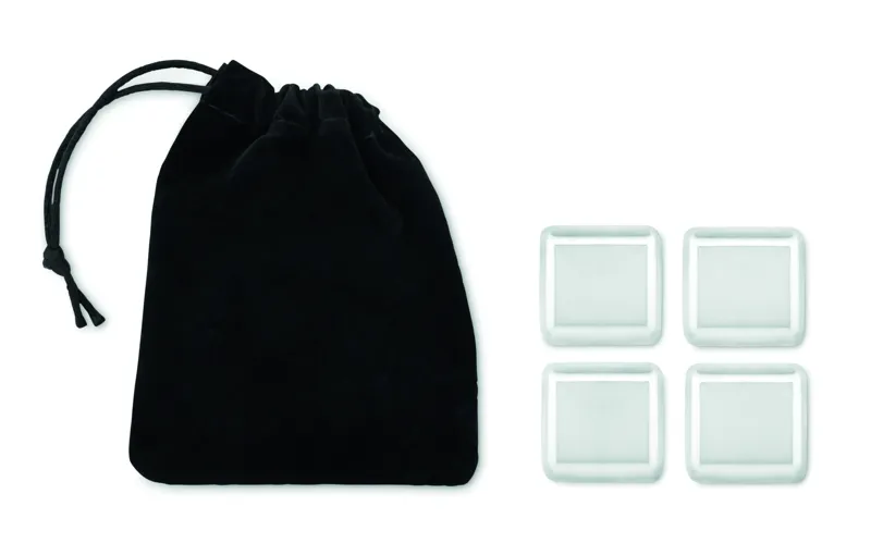 4 db többször használható, rozsdamentes acélból készült jégkocka szett, bársony tasakban.