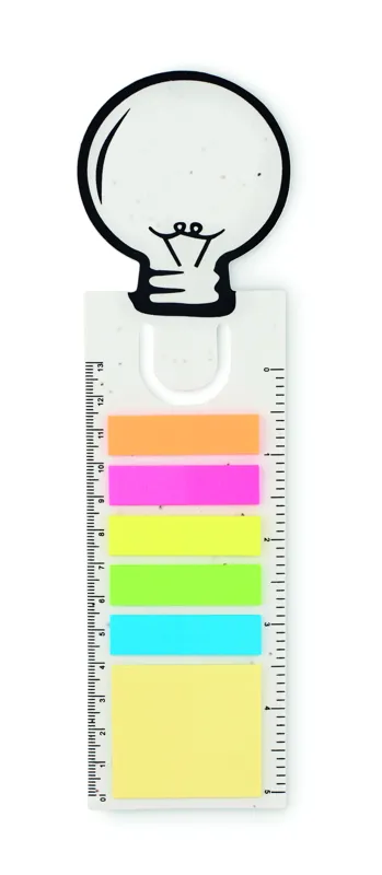 Magpapír könyvjelző villanykörte alakban, tartalmaz egy 13 cm-es vonalzós alapot, 1 sárga, újrahasznosított papírból készült öntapadós jegyzettömböt és 5 színű öntapadós jelölőket. Használat után a borítót földbe ültetve a benne lévő magokból pipacsok hajtanak ki.