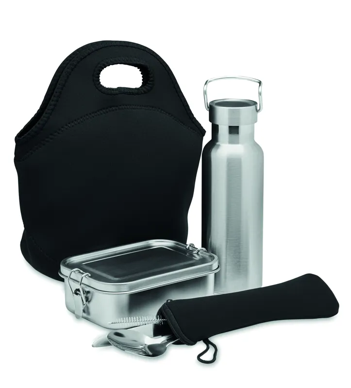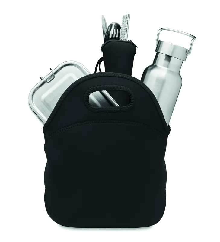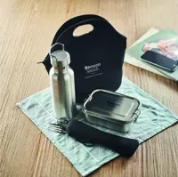 Ebédkészlet neoprén táskában. Tartalmaz duplafalú rozsdamentes acél termoszpalackot (500 ml), uzsonnásdobozt (600 ml) és evőeszközöket, cipzáras neoprén tokban.