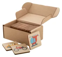Rétegelt nyírfából készült memóriajáték tematikus figurákkal. 24 lapka (40×40 mm). Az ár tartalmazza az emblémázás költségét, 1 színnel nyomva az összes lapka hátoldalán. Minimális rendelési mennyiség: 50 db.
