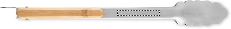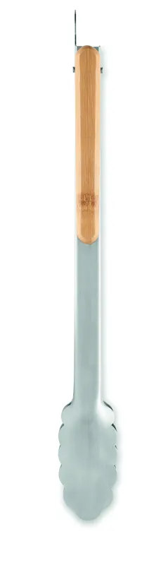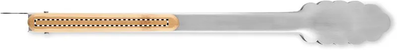 Rozsdamentes acél húsfogó csipesz bambuszmarkolattal. Zárószerkezettel. A bambusz természetes anyag, színében, mintázatában és méretében esetenként eltérő lehet.
