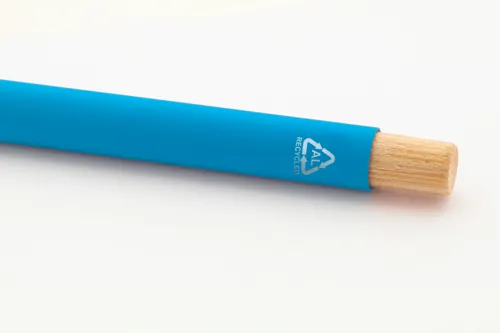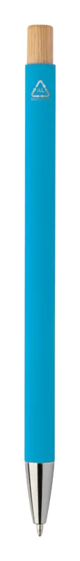 Újrahasznosított alumínium golyóstoll gumírozott felülettel, bambusz gombbal és króm részekkel. Speciális bevonattal rendelkezik, amely különlegesen fényessé teszi a gravírozott emblémát. Kék tollbetéttel szállítjuk.