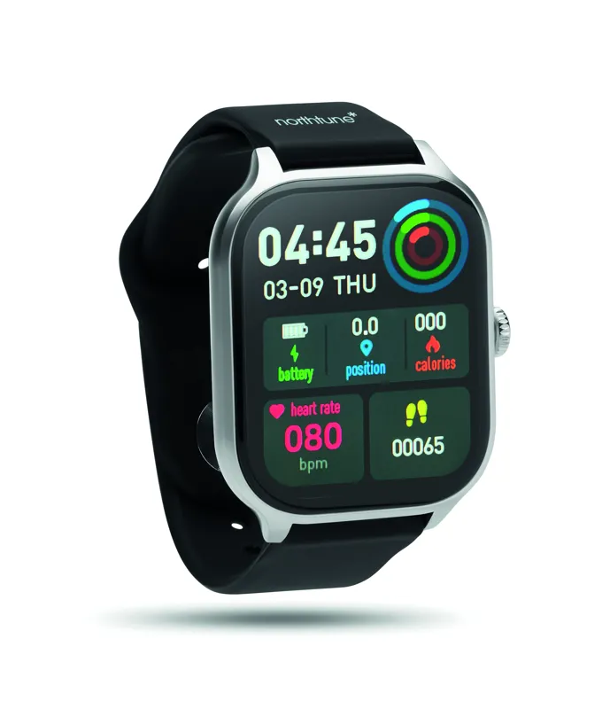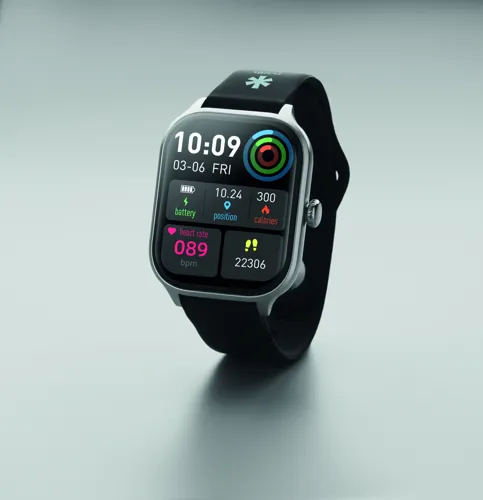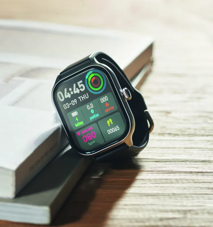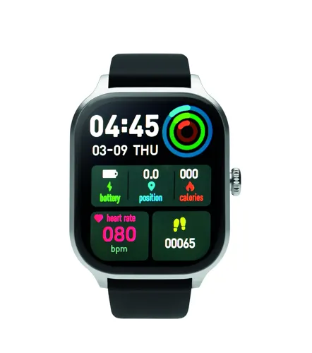 5.4 vezeték nélküli egészségügyi okosóra (health watch) cink ötvözetből, szilikon szíjjal. 2,01 colos érintős LCD kijelző. Újratölthető 180 mAh lítium-polimer elem. iOS és Android rendszerre egyaránt ingyenesen elérhető alkalmazással (HryFine) működik.